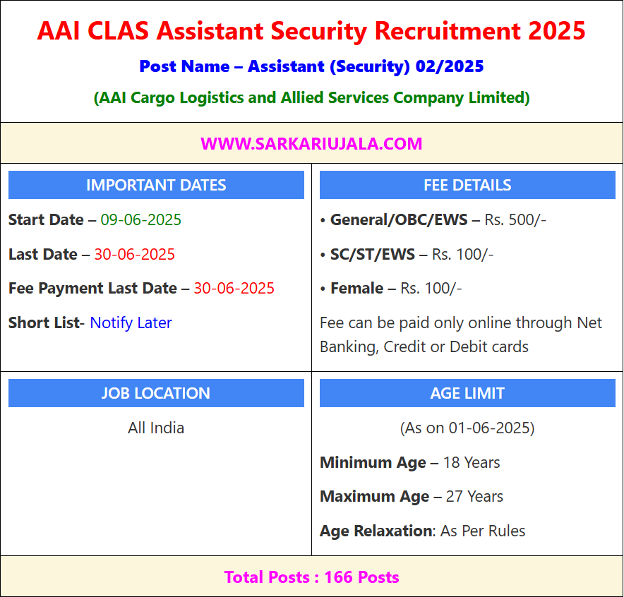 Post Description – The Airports Authority of India (AAI) has released the AAI Junior Executive Recruitment 2025 for 166 posts of Junior Executive (02/2025). Eligible Candidates Can apply Online Form. Details Of Recruitment Of AAI Junior Executive Online Form 2025Posts Name – Assistant (Security) Number Of Posts – 166 Posts Trade Wise Posts – Patna – 23 Posts Vijayawada – 24 Posts Vadodara– 09 Posts Port Blair – 03 Posts Goa – 53 Posts Chennai – 54 Posts Pay Scale – Rs. 21,500 – 22,500/- Education Qualification – 12th from any recognized Board /University/ Institution, with minimum 60% marks for General and 55% for SC/ST candidates. How to Apply Online AAI CLAS Security Assistant Online Form 2025 – Candidates can apply through link provided below or they can also apply through official site of the AAI Cargo Logistics and Allied Services Company Limited before 30/June/2025. Required Documents For Online Application – Educational Mark sheet And Certificates Aadhar Card / Pan Card Passport Size Photo Signature Selection Mode – Written Exam Final Merit List