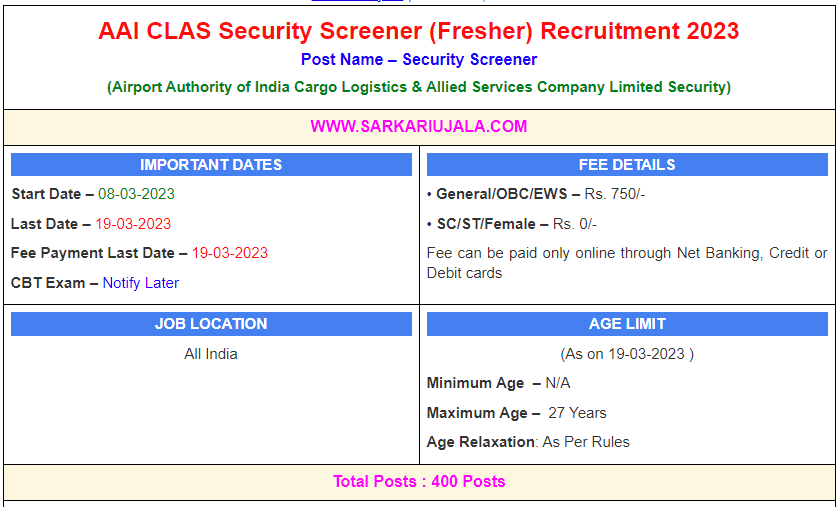 Post Description – AAICLAS Airports Authority of India is inviting online applications for Security Screener for 400 posts. Interested people meet all the eligibility criteria, apply online Details Of Recruitment Of AAICLAS Security Screener Online Form 2023Posts Name – Security Screener Number Of Posts – 400 Posts Pay Scale – As Per Rules Education Qualification – Bachelor Degree in Any Stream with Minimum 60% Marks. (For SC / ST : 55% Marks Required) How to Apply Online AAI CLAS Security Screener Online Form 2023 – Candidates can apply through link provided below or they can also apply through official site of the Airports Authority of India before 19/March/2023. Required Documents For Online Application – Educational Mark sheet And Certificates Aadhar Card / Pan Card Passport Size Photo Signature Selection Mode – CBT Exam Interview Final Merit List