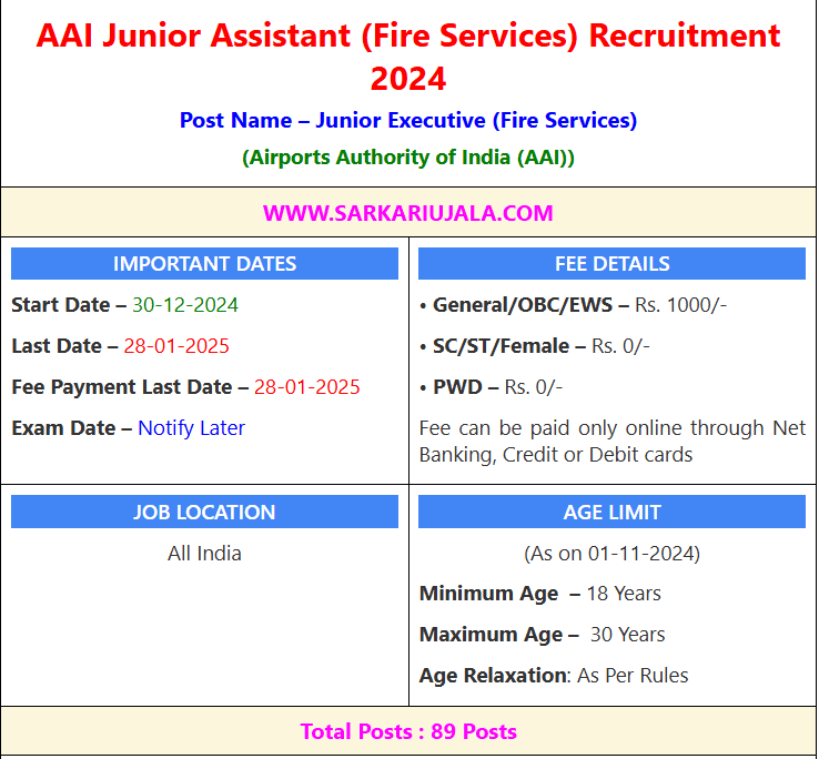 Post Description – The Airports Authority of India (AAI) is recruiting for the Junior Executive (Fire Services) post in 2024. The application process begins on December 30, 2024, and ends on January 28, 2025. The last date for fee payment is also January 28, 2025. The exam date will be announced later. There are 89 vacancies for this position. The application fee is ₹1000 for General, OBC, and EWS candidates, while it is free for SC, ST, Female, and PWD applicants. Fees can only be paid online using Net Banking, Credit Card, or Debit Card. The job is open across India, and the age limit as of November 1, 2024, is between 18 and 30 years, with age relaxation as per government rules. Details Of Recruitment Of AAI Junior Executive Online Form 2024Posts Name – Junior Executive (Fire Services) Number Of Posts – 89 Posts Trade Wise Posts – General – 45 Posts EWS- 08 EWS OBC (NCL)- 14 Posts SC- 10 Posts ST– 12 Posts Pay Scale – Rs 31000 – 92000/- Education Qualification – 10th Passed And 3 years approved regular Diploma in Mechanical / Automobile /Fire. OR 12th Pass (Regular Study). Height – 167 cms(Male) , 157 cms (Female) Chest – 81cms – 86 Cms (Men Only) How to Apply Online AAI Junior Executive ATC Online Form 2024 – Candidates can apply through link provided below or they can also apply through official site of the Airports Authority of India before 28/January/2025. Required Documents For Online Application – Educational Mark sheet And Certificates Aadhar Card / Pan Card Passport Size Photo Signature Selection Mode – CBT Exam | |||||