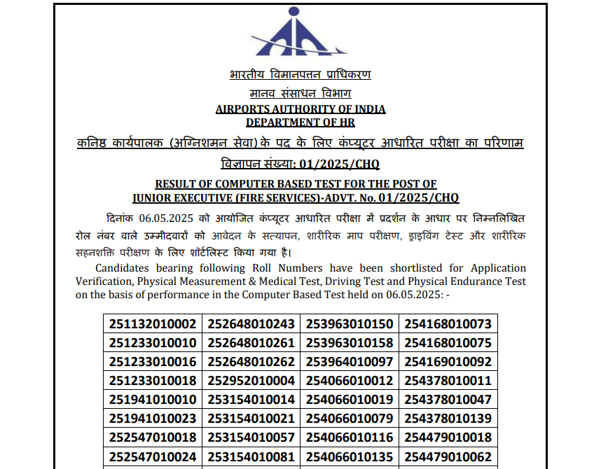 Post Description : AAI The Airport Authority of India has released the Exam Date for the AAI Junior Executive Recruitment 2025. Which Exam Date is 06 May 2025 . Interested candidates can download their admit card by using their Application number and date of birth . Instructions for Downloading the AAI Junior Executive Admit Card 2025: 1. In order to download their AAI Junior Executive Admit Card 2025 candidates are required to go to the important link section provided below. 2. After getting the link candidates need to click it for downloading their AAI Junior Executive Admit Card. 3. Candidates need to provide their following details-: Registration No. /Roll No. DOB/Password Captcha Code(if specified) 4. After providing their details appropriately candidates will be able to download their AAI Junior Executive Admit Card. 5.Candidates can also download their Admit Card from official site of the AAI.
