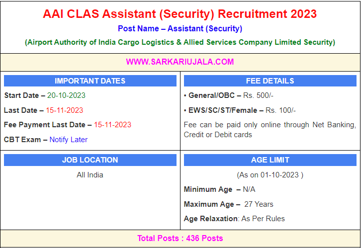 Post Description – AAICLAS Airports Authority of India is inviting online applications for Assistant Security for 436 posts. Interested people meet all the eligibility criteria, apply online Details Of Recruitment Of AAICLAS Assistant Security Online Form 2023Posts Name – Assistant Security Number Of Posts – 436 Posts Pay Scale – Rs. 21,500/- To Rs. 22,500/- Education Qualification – 12th with Minimum 60% Marks. (For SC / ST : 55% Marks Required) How to Apply Online AAI CLAS Assistant Security Online Form 2023 – Candidates can apply through link provided below or they can also apply through official site of the Airports Authority of India before 15/November/2023. Required Documents For Online Application – Educational Mark sheet And Certificates Aadhar Card / Pan Card Passport Size Photo Signature Selection Mode – Written Exam | |||||