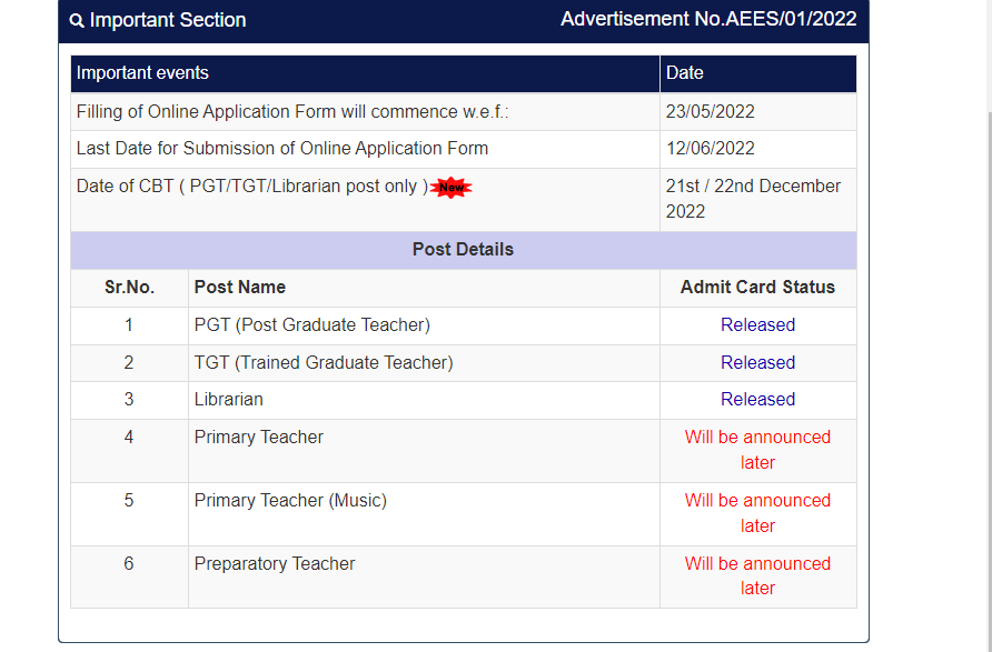 IMPORTANT DATESExam Date (PGT/TGT/Librarian) – 21-22 Dec 2022 Admit Card – 06-12-2022 | VACANCY DETAILSExam Name – AEES TGT,PGT,PRT & Librarian Recruitment 2022 Total Vacancy- 205 Posts | ||||