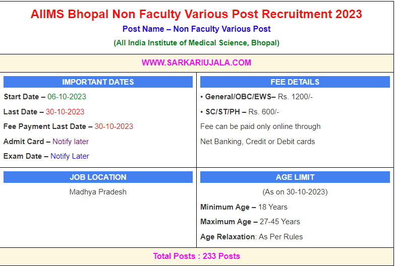 Post Description – AIIMS All India Institute of Medical Science, Bhopal is inviting online applications for Non Faculty Various Post for 233 posts. Interested people meet all the eligibility criteria, apply online Details Of Recruitment Of AIIMS Bhopal Non Faculty Various Post Online Form 2023Posts Name – Non Faculty Various Post Number Of Posts – 233 Posts Category Wise Posts – Store Keeper Cum-Clerk – 85 Posts Office/Stores Attendant (Multitasking) – 40 Posts Lower Division Clerk LDC – 32 Posts Stenographer (S) – 34 Posts Driver (Ordinary Grade) – 16 Posts Junior Warden (House Keeper) – 10 Posts Dissection Hall Attendants – 08 Posts Upper Division Clerk UDC – 02 Posts Data Entry Operator DEO Grade A – 02 Posts Junior Scale Steno (Hindi) – 01 Posts Security-cum-Fire Jamadar – 01 Posts Social Worker – 02 Posts Pay Scale – Rs.19500 – 62000/- + Grade Pay Rs.1900/- Education Qualification – Store Keeper Cum-Clerk – Bachelor Degree in Any Stream with 1 Year Experienc Office/Stores Attendant (Multitasking) – 10th High School OR ITI Exam Passed Lower Division Clerk LDC – 10+2 Passed in Any Recognized Board in India English And Typing 35 WPM OR Hindi Typing 30 WPM. Stenographer (S) – 10+2 Passed in Any Recognized Board in India And Dictation 10 Minutes at 80 WPM And Transcription 50 Min English OR 65 Min Hindi on Computer Driver (Ordinary Grade) – 10th with LMV and HMV Commercial License with 2 Year Experience Junior Warden (House Keeper) – Bachelor Degree in Any Stream with 2 Year Experience. Dissection Hall Attendants – 10+2 Passed In Any Recognized Board in India OR Class 10th High School with 3 Year Experience. Upper Division Clerk UDC – Bachelor Degree in Any Stream in Any Recognized University in India And English Typing 35 WPM OR Hindi Typing 30 WPM Data Entry Operator DEO Grade A – Passed 10+2 Intermediate Exam In Any Recognized Board in India. 8000 Key Depression Speed Junior Scale Steno (Hindi) – 10+2 Exam Passed In Any Recognized Board in India. And Shorthand Speed 64 WPM, And Transcription Speed 11 WPM Security-cum-Fire Jamadar – 10+2 Passed In Any Recognized Board in India. And Height 167 CMS, Chest 80 CMS Social Worker – 10+2 Exam Passed in Any Recognized Board in India with 8 Year Experience. How to Apply Online AIIMS Bhopal Non Faculty Various Post Online Form 2023 – Candidates can apply through link provided below or they can also apply through official site of the All India Institute of Medical Science, Bhopal before 30/October/2023. Required Documents For Online Application – Educational Mark sheet And Certificates Aadhar Card / Pan Card Passport Size Photo Signature Selection Mode – Written Exam Skill Test Merit List