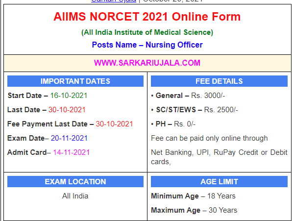 Post Description – All India Institute of Medical Science is inviting online applications for Nursing Officer Posts for NORCET 2021. Interested people meet all the eligibility criteria, apply online Details Of Recruitment Of AIIMS NORCET 2021 Online FormExam Name – NORCET Education Qualification – B.Sc Nursing and Registered as a Nurses and Midwife with State / Indian Nursing Council. OR Diploma in General Nursing Midwifery and Registered as a Nursery and Midwife in State / Nursing Council with 2 Year Experience in 50 Bedded Hospital Participating AIIMS– AIIMS Rae Bareli , AIIMS Gorakhpur, AIIMS Patna , AIIMS New Delhi, AIIMS Rishikesh, AIIMS Deoghar, AIIMS Bhopal , AIIMS Jodhpur , AIIMS Nagpur, AIIMS Mangalagi, , AIIMS Bilaspur, AIIMS Bibinagar, AIIMS Bhuvneshwar ,AIIMS Raipur ,AIIMS Rajkot, AIIMS Kalyani , AIIMS Vijaypur ,AIIMS Bathinda How to Apply Online AIIMS NORCET 2021 Online Form – Candidates can apply through link provided below or they can also apply through official site of the All India Institute of Medical Science before 30/Oct/2021. Required Documents For Online Application – Educational Mark sheet And Certificates Aadhar Card / Pan Card Passport Size Photo Signature Selection Mode – Online CBT Examination Final Seat Allotment List