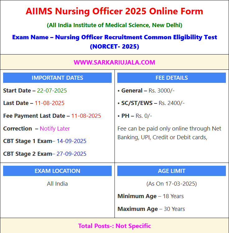 AIIMS Nursing Officer 2025 Online Form(All India Institute of Medical Science, New Delhi) Exam Name – Nursing Officer Recruitment Common Eligibility Test (NORCET- 2025) | |||||