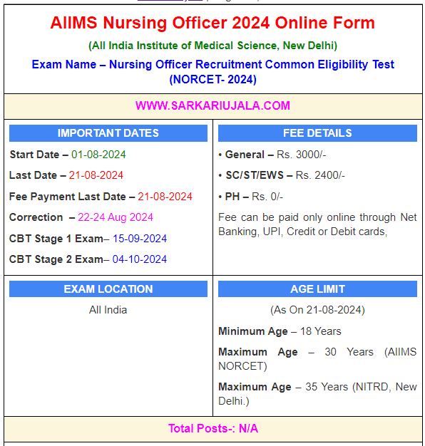 AIIMS Nursing Officer 2024 Online Form(All India Institute of Medical Science, New Delhi) Exam Name – Nursing Officer Recruitment Common Eligibility Test (NORCET- 2024) | |||||