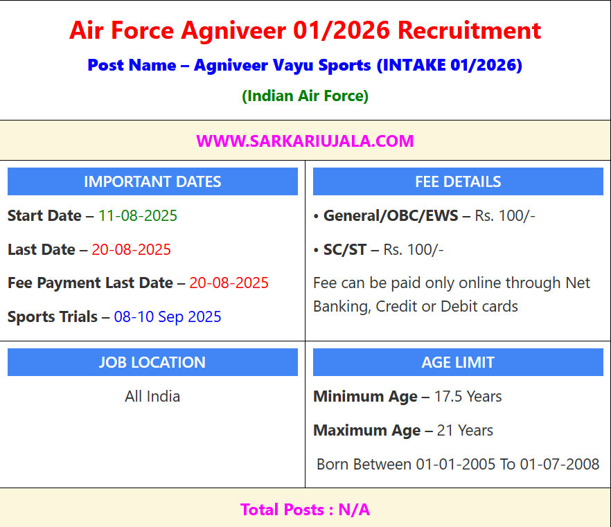 Post Description – Indian Air Force is inviting online applications for Agniveer Vayu (Sports) posts. Interested people meet all the eligibility criteria, apply online Details Of Recruitment Of Air Force Agniveer (Sports) 01/2026 Online FormPosts Name – Agniveer Vayu (Sports) Number Of Posts – N/A Pay Scale – First Year- 30,000 Per Years Second Year- 33,000 Per Years Third Year- 36,500 Per Years Fourth Year- 40,000 Per Years Exit After 4 Year – Rs 10.04 Lakh as Seva Nidhi Package & Skill Gained Certificate & Rs. 48 Lakh Life Insurance Cover. Up to 25% will be enrolled in the regular cadre of the Indian Airforce Education Qualification – Science Subjects – 12th Passed with Math , Physics and English with 50% marks in aggregate and 50% marks in English. OR 3 years Diploma Course in Engineering with 50% marks in aggregate and 50% marks in English in diploma course. OR 02 years Vocational course with non-vocational subject With Physics and Math with 50% marks in aggregate and 50% marks in English in vocational course And Sports Qualification. Other Than Science Subjects – 12th Passed in any subject with minimum 50% marks in aggregate and 50% marks in English. OR 2 Year Vocation Course with Minimum 50% Aggregate and 50% Marks in English. And Sports Qualification. Physical Standard Height- 152.5 Cms Chest – Minimum range of expansion 5 cm Running- 1600 Meter in 6 Minute 30 Second Push ups – 10 Sit-Ups – 10 Squats – 20 How to Apply Online Air Force Agniveer (Sports) 01/2026 Online Form – Candidates can apply through link provided below or they can also apply through official site of the Indian Air Force before 20/August/2026. Required Documents For Online Application – 10th / 12th Mark sheet And Certificates Aadhar Card / Pan Card Passport Size Photo Signature Selection Mode – CBT Exam PET/PST Medical Final Merit List