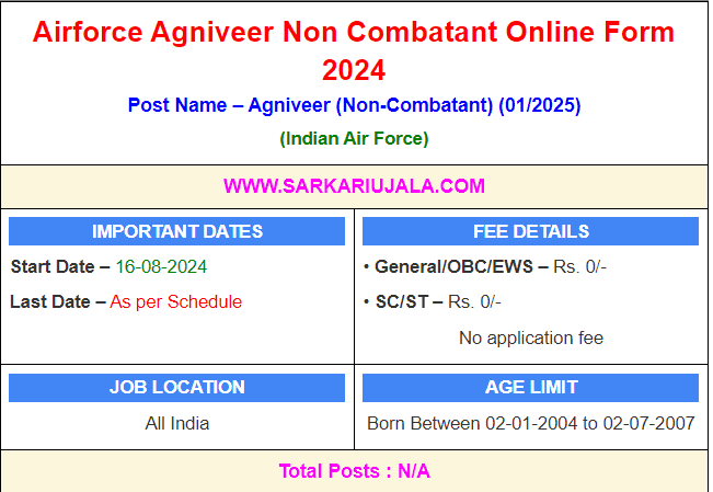 Airforce Agniveer Vayu Non Combatant 01/2025 RecruitmentPost Name – Agniveer (Non-Combatant) (01/2025)(Indian Air Force) | |||||