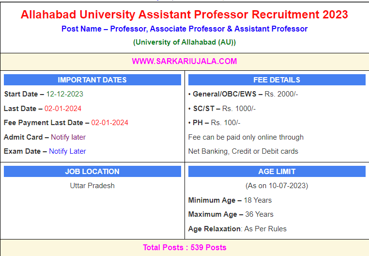 Post Description – AU University of Allahabad is inviting online applications for Professor, Associate Professor & Assistant Professor for 539 posts. Interested people meet all the eligibility criteria, apply online Details Of Recruitment Of Allahabad University Assistant Professor Online Form 2023Posts Name – Professor, Associate Professor & Assistant Professor Number Of Posts – 539 Posts Category Wise Posts – Assistant Professor in Various Subject– 336 Posts Associate Professor in Various Subject – 137 Posts Professor in Various Subject – 66 Posts Pay Scale – As Per Rules Education Qualification – Assistant Professor in Various Subject – Master Degree in Related Subject with Minimum 55% Marks with NET / JRD / PHd . Associate Professor in Various Subject – Master Degree in Related Subject with Minimum 55% Marks. Professor in Various Subject – Master Degree in Related Subject with Minimum 55% Marks. Note-: For More & Subject Wise Eligibility Details Must Read the Official Notification. How to Apply Online Allahabad University Assistant Professor Online Form 2023 – Candidates can apply through link provided below or they can also apply through official site of the University of Allahabad (AU) before 02/January/2024. Required Documents For Online Application – Educational Mark sheet And Certificates Aadhar Card / Pan Card Passport Size Photo Signature Selection Mode – Written Exam Merit List | |||||