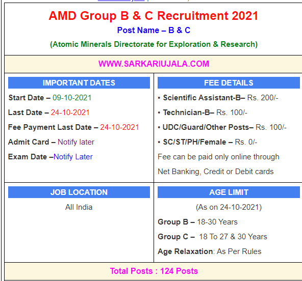 Post Description – Atomic Minerals Directorate for Exploration & Research is inviting online applications for Various for 124 posts. Interested people meet all the eligibility criteria, apply online Details Of Recruitment Of AMD Various Posts Online Form 2021Posts Name – Various Posts Number Of Posts – 124 Posts Category Wise Posts – Scientific Assistant-B (Physics) – 4 Posts Scientific Assistant-B (Chemistry) – 5 Posts Scientific Assistant-B (Geology) – 14 Posts Scientific Assistant-B (Electronics/ Instrumentation) – 2 Posts Scientific Assistant-B [Computer Science/Information Technology (IT)] – 9 Posts Scientific Assistant-B (Electrical) – 1 Posts Scientific Assistant-B (Civil) – 1 Posts Technician-B (Physics/Electronics/ Instrumentation) – 4 Posts Technician-B (Laboratory) – 14 Posts Technician-B (Plumber) – 1 Posts Technician-B (Binding) – 1 Posts Technician-B (Printing) – 1 Posts Technician-B (Drilling) – 20 Posts Upper Division Clerk (UDC) – 16 Posts Driver (Ordinary Grade) – 13 Posts Security Guard – 18 Posts Pay Scale – As Per Rules Education Qualification – Scientific Assistant B – Bachelor With Related Subject with 60% Marks Technician B– 10th With 60% Marks And ITI In Related Trade. UDC– Bachelor Degree With 50% Marks 30 WPM English . Driver– 10th Passed With 3 Years Old Driving License. Security Guard– 10th Passed How to Apply Online AMD Group B & C Online Form 2021 – Candidates can apply through link provided below or they can also apply through official site of the Atomic Minerals Directorate for Exploration & Research before 24/Oct/2021. Required Documents For Online Application – Educational Marksheet And Certificates Aadhar Card / Pan Card Passport Size Photo Signature Selection Mode – Written Examination Interview PET/PST Final Merit List