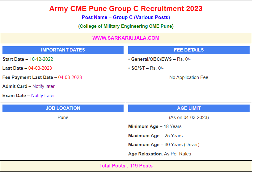 Army CME Pune Group C Recruitment 2023Post Name – Group C (Various Posts)(College of Military Engineering CME Pune) | |||||