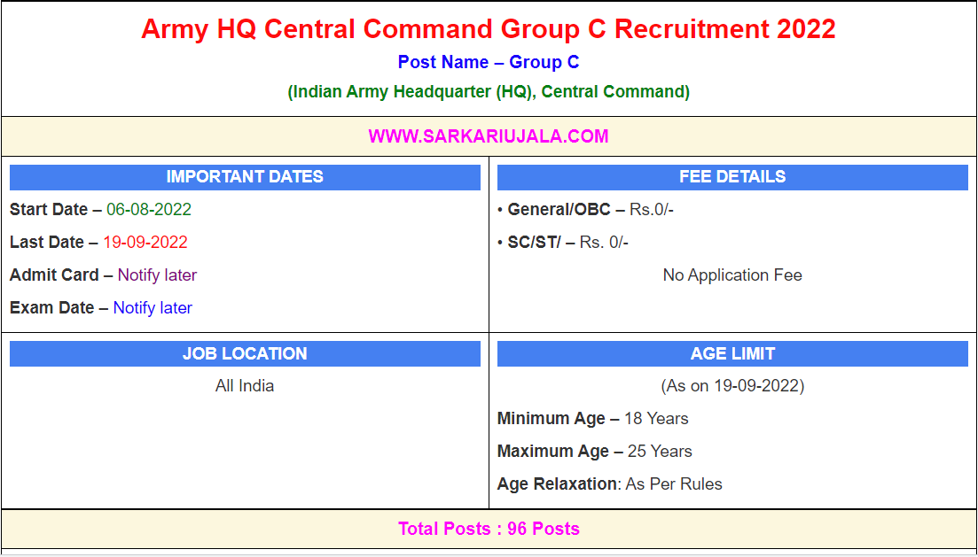 Army HQ Central Command Group C Recruitment 2022Post Name – Group C(Indian Army Headquarter (HQ), Central Command) | |||||