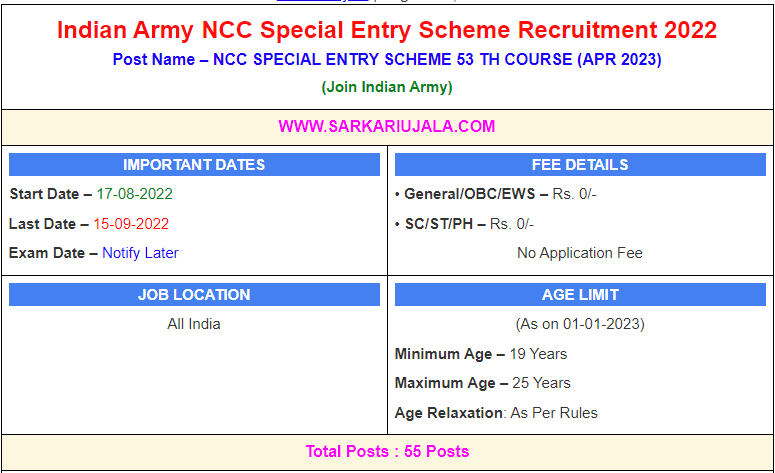 How to Apply Online Indian Army NCC 53 Special Entry Online Form 2022Candidates can apply through link provided below or they can also apply through official site of the Join Indian Army before 15/Sep/2022.
