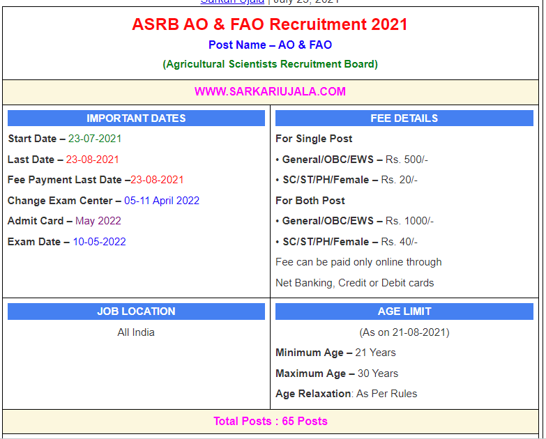 Post Description – ASRB Agricultural Scientists Recruitment Board is inviting online applications for AO & FAO for 65 posts. Interested people meet all the eligibility criteria, apply online Details Of Recruitment Of ASRB AO & FAO Online Form 2021Posts Name – AO & FAO Number Of Posts – 65 Posts Category Wise Posts – Administrative Officer(AO) – 44 Posts General – 17 Posts OBC – 14 Posts SC – 07 Posts ST – 02 Posts EWS – 04 Posts Finance & Accounts Officer (FAO) – 21 Posts General – 13 Posts OBC – 04 Posts SC – 02 Posts ST – 00 Posts EWS – 02 Posts Pay Scale – Rs.15600 – Rs.39100 + Rs. 5400-GP Education Qualification – Bachelor Degree in Any Stream with Minimum 55% Marks. How to Apply Online ASRB AO & FAO Online Form 2021 – Candidates can apply through link provided below or they can also apply through official site of the Agricultural Scientists Recruitment Board before 23/Aug/2021. Required Documents For Online Application – Educational Mark sheet And Certificates Aadhar Card / Pan Card Passport Size Photo Signature Selection Mode – Written Examination Interview Final Merit List