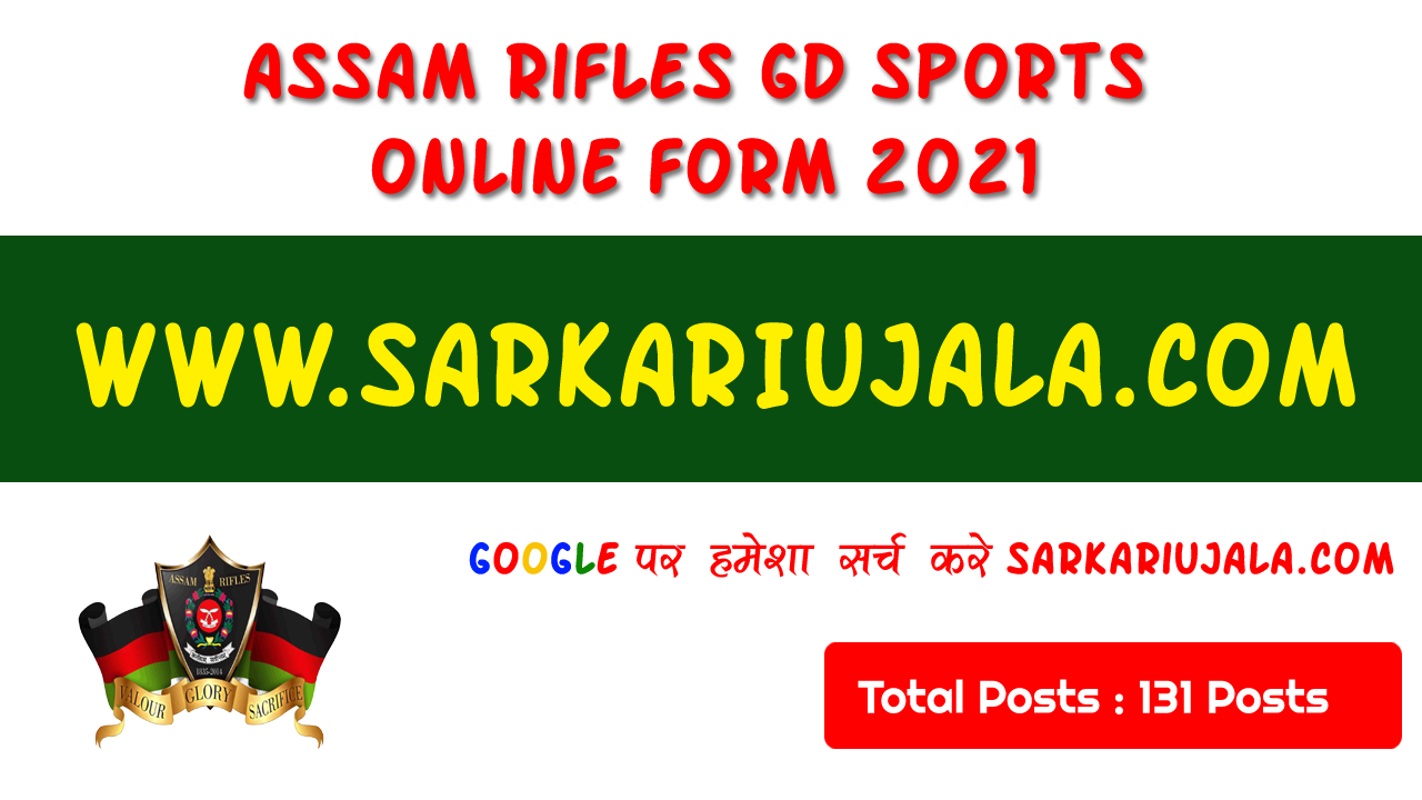 Post Description – Assam Rifles is inviting online applications for GD Constable for 131 posts. Interested people meet all the eligibility criteria, apply online Details Of Recruitment Of Assam Rifles GD Sports Online Form 2021Posts Name – GD Constable Number Of Posts – 131 Posts Category Wise Posts – Rifleman (Men) – 75 Posts Rifleman (Women) –56 Posts Sport Wise Posts – Archery – 08 Posts Karate – 08 Posts Taekwondo – 09 Posts Judo – 18 Posts Equestrian – 14 Posts Fencing – 04 Posts Wushu – 18 Posts Football – 14 Posts Boxing – 14 Posts Polo – 04 Posts Athletics – 06 Posts Shooting – 10 Posts Pay Scale – Rs. 21700/- To Rs. 69100/- Education Qualification – 10th Class Passed With Sport Certificate (National/Inter-University) Physical Standard Height & Chest Height: 170cm (Male), 157Cm (Female) Chest : 80cm -85 Cm How to Apply Online Assam Rifles GD Sports Online Form 2021 – Candidates can apply through link provided below or they can also apply through official site of the Assam Rifles before 26/July/2021. Required Documents For Online Application – Educational Mark sheet And Certificates Aadhar Card / Pan Card Passport Size Photo Signature Selection Mode – Written Examination PET/PST Medical Test Document verification Final Merit List