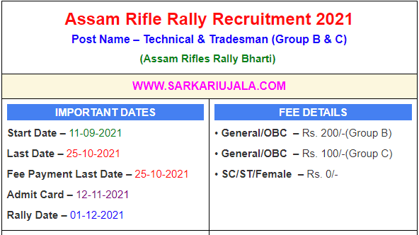 Assam Rifle Rally Recruitment 2021Post Name – Technical & Tradesman (Group B & C)(Assam Rifles Rally Bharti) | |||||