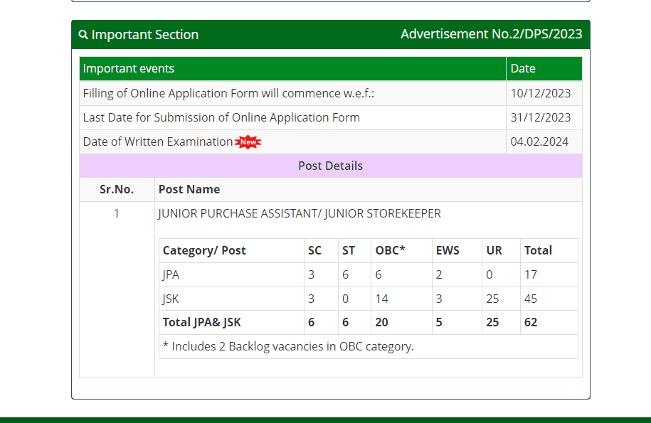 IMPORTANT DATESExam Date – 04-02-2024 Admit Card – 15-01-2024 Result Date– 26-04-2024 | VACANCY DETAILSExam Name – Atomic Energy DPS DAE JPA / JSK Recruitment 2024 Total Vacancy- 65 Posts Advt. No. – 02/DPS/2023 | ||||