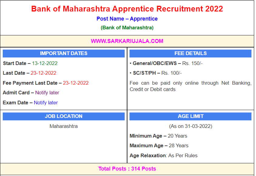 Post Description – BOM Bank of Maharashtra is inviting online applications for Apprentice for 314 posts. Interested people meet all the eligibility criteria, apply online Details Of Recruitment Of Bank of Maharashtra Apprentice Online Form 2022Posts Name – Apprentice Number Of Posts – 314 Posts Category Wise Posts – Andhra Pradesh – 10 Posts Chandigarh – 02 Posts Chhattisgarh – 02 Posts Delhi – 10 Posts Goa – 04 Posts Gujarat – 06 Posts Karnataka – 08 Posts Madhya Pradesh – 22 Posts Maharashtra – 207 Posts Punjab– 05 Posts Rajasthan – 03 Posts Tamil Nadu – 10 Posts Uttar Pradesh – 20 Posts West Bengal – 05 Posts Stipend – 9000/- Per Month Education Qualification – Bachelor Degree In Any Stream & Knowledge Of local Language. How to Apply Online Bank of Maharashtra Apprentice Online Form 2022 – Candidates can apply through link provided below or they can also apply through official site of the Bank of Maharashtra before 23/Dec/2022. Required Documents For Online Application – Educational Mark sheet And Certificates Aadhar Card / Pan Card Passport Size Photo Signature Selection Mode – Written Examination Merit List