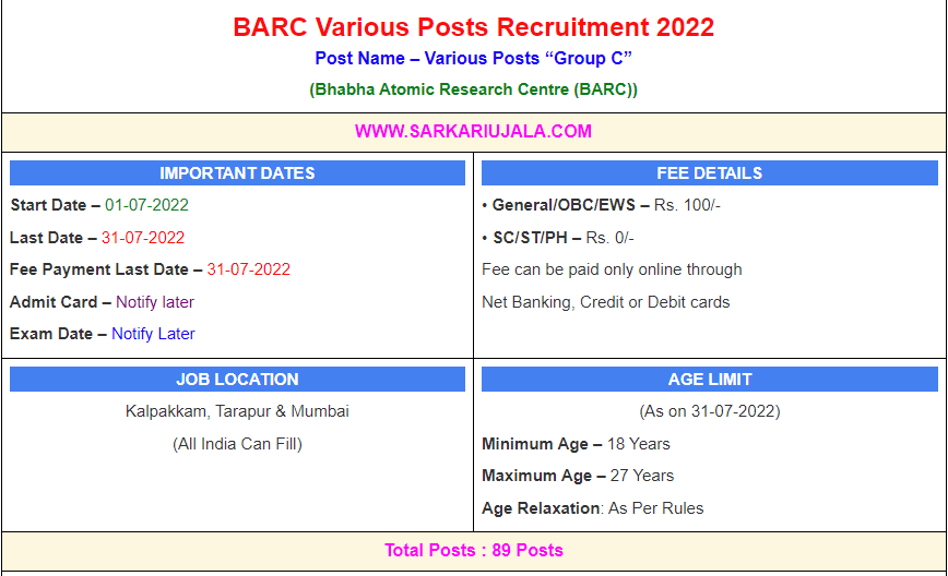Post Description –BARC Bhabha Atomic Research Centre is inviting online applications for Various Posts Of Group C for 89 posts. Interested people meet all the eligibility criteria, apply online Details Of Recruitment Of BARC Group C Online Form 2022Posts Name – Various Posts “Group C” Number Of Posts – 89 Posts Category Wise Posts – Work Assistant – A– 72 Posts Stenographer Grade – III – 06 Posts Driver – 11 Posts Pay Scale – As Per BARC Rules Education Qualification – Work Assistant – A- 10th Passed From A Recognized Board. Stenographer Grade – III – 10th Passed With 50% Marks & English Steno 80 WPM & English Typing 30 WPM Driver- 10th Passed & LMV/HMV Driving License With 3 years Driving Experience How to Apply Online BARC Group C Online Form 2022 – Candidates can apply through link provided below or they can also apply through official site of the Bhabha Atomic Research Centre before 31/July/2022. Required Documents For Online Application – Educational Mark sheet And Certificates Aadhar Card / Pan Card Passport Size Photo Signature Selection Mode – Written Examination Skill Test (If Applicable) Final Merit List