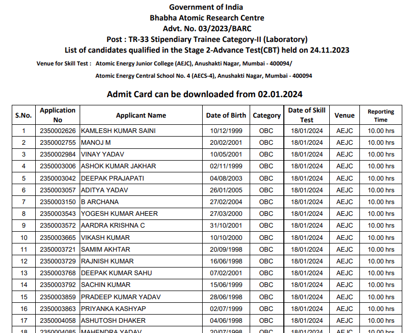 BARC Various Post Admit Card 2023Post Name – Various Post(Bhabha Atomic Research Centre) | |||||