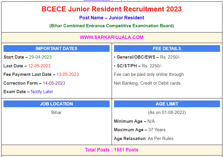 BCECE Junior Resident Recruitment 2023Post Name – Junior Resident(Bihar Combined Entrance Competitive Examination Board) | |||||