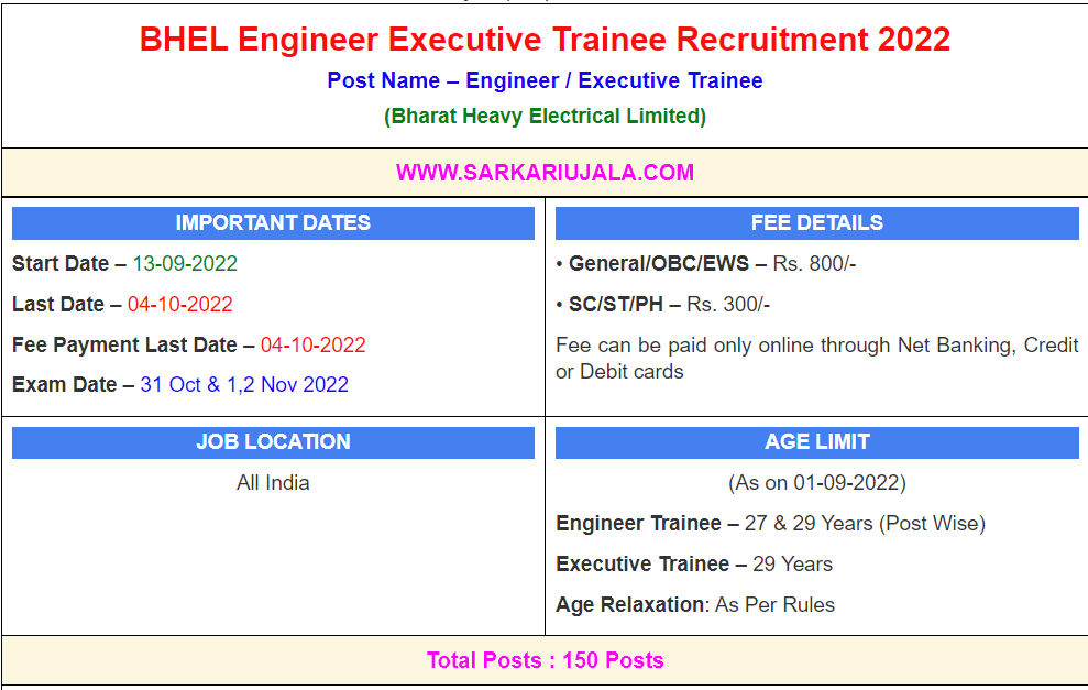 Post Description –BHEL Bharat Heavy Electrical Limited is inviting online applications for Engineer / Executive Trainee for 150 posts. Interested people meet all the eligibility criteria, apply online Details Of Recruitment Of BHEL Engineer Executive Online Form 2022Posts Name – Engineer / Executive Trainee Number Of Posts – 150 Posts Category Wise Posts – Civil Engineer – 40 Posts Mechanical Engineer-30 Posts IT/ Comp. Sc Engineer-20 Posts Electrical Engineer-15 Posts Chemical Engineer-10 Posts Metallurgy Engineer-05 Posts Finance-20 Posts HR- 10 Posts Pay Scale – Rs.50000 – 160000/- Education Qualification – Engineer Trainee (Civil/ ME/ IT/ EE/ Chemical/ Metallurgy) – Engineering Degree in Related Field Executive Trainee (Finance)- Graduate + Chartered Accountant (CA) Executive Trainee (HR)- Graduate With 60% Marks & MBA/ Diploma in Human Resource (HR) How to Apply Online BHEL Engineer Executive Online Form 2022 – Candidates can apply through link provided below or they can also apply through official site of the Bharat Heavy Electrical Limited before 04/Oct/2022. Required Documents For Online Application – Educational Mark sheet And Certificates Aadhar Card / Pan Card Passport Size Photo Signature Selection Mode – CBT Exam Interview Merit List