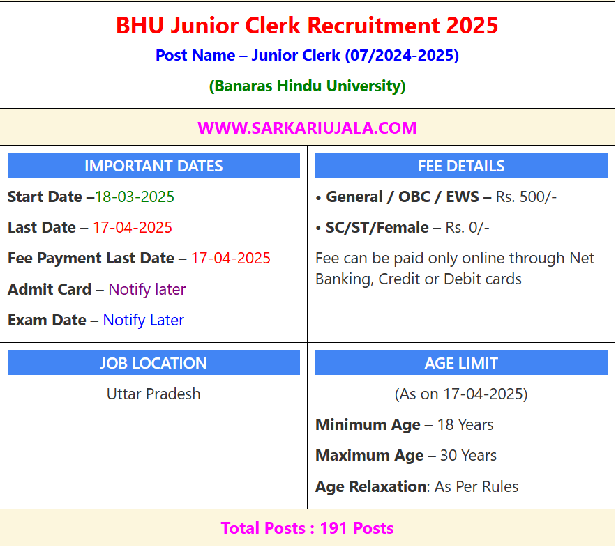 Post Description – BHU Banaras Hindu University is inviting online applications for Junior Clerk for 191 posts. Interested people meet all the eligibility criteria, apply online Details Of Recruitment Of BHU Junior Clerk Online Form 2025 Posts Name – Junior Clerk Number Of Posts – 191 Posts Category Wise Posts – General – 80 Posts OBC – 50 Posts SC – 28 Posts ST – 13 Posts EWS – 20 Posts Pay Scale – As Per Rules Education Qualification – Bachelor Degree with Second Class with 6 Month Training on the Use of Computer for Office Automation, Book Keeping and Word Processing OR Bachelor Degree with Second Class with Diploma in Computer from AICTE And English Typing 30 WPM OR Hindi 25 WPM. How to Apply Online BHU Junior Clerk Online Form 2025 – Candidates can apply through link provided below or they can also apply through official site of the Banaras Hindu University before 17/April/2025. Required Documents For Online Application – Educational Mark sheet And Certificates Aadhar Card / Pan Card Passport Size Photo Signature Selection Mode – Written Exam Skill Test Final Merit List | |||||