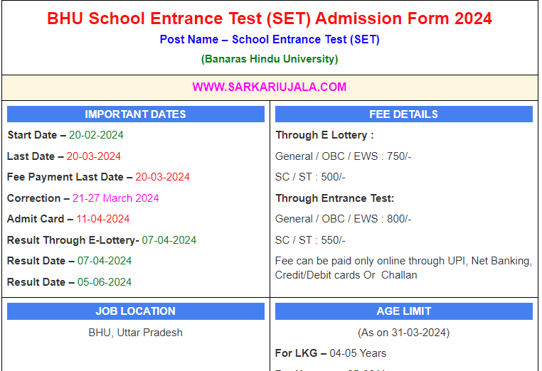 Post Description –BHU Banaras Hindu University is inviting online applications for BHU School Entrance Test for 695 Seats. Interested people meet all the eligibility criteria, apply online Details Of Recruitment Of BHU School Entrance Test (SET) 2024 Online FormExam Name – BHU Entrance Test (SET) Number Of Seat – 695 Posts Category Wise Posts – LKG- 120 Seats Nursery- 40 Seats Class 1- 40 Seats Class 6- 150 Seats Class 9- 110 Seats Class 11 (Math)- 104 Seats Class 11 (Biology) – 42 Seats Class 11 (Commerce) – 37 Seats Class 11 (Arts) – 52 Seats Education/Eligibility – LKG – Born Between 31-03-2019 & 31.03.2020 Nursery- Born Between 31-03-2018 & 31.03.2019 Class 1- Born Between 31-03-2016 & 31.03.2018 Class 6- Class V Passed Class 9- Class VIII Passed Class 11 (Science)- Class 10th Passed With 60% Marks (50% Each, Maths and Science Subject) Class 11 (Biology) – Class 10th Passed With 55% Marks Class 11 (Commerce) – Class 10th Passed With 55% Marks Class 11 (Arts) – Class 10th passed How to Apply Online BHU School Entrance Test (SET) 2024 Online Form – Candidates can apply through link provided below or they can also apply through official site of the Banaras Hindu University before 20/Mar/2024. Required Documents For Online Application – Educational Mark sheet And Certificates Aadhar Card / Pan Card Passport Size Photo Signature Selection Mode – Entrance Exam/E-Lottery Merit List