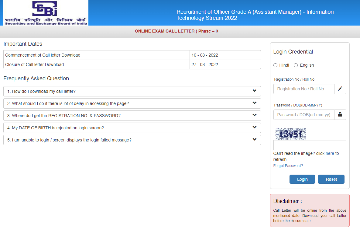 SEBI Assistant Manager IT Admit Card 2022Post Name – Grade A (Assistant Manager IT)(Security and Exchange Board of India) | |||||