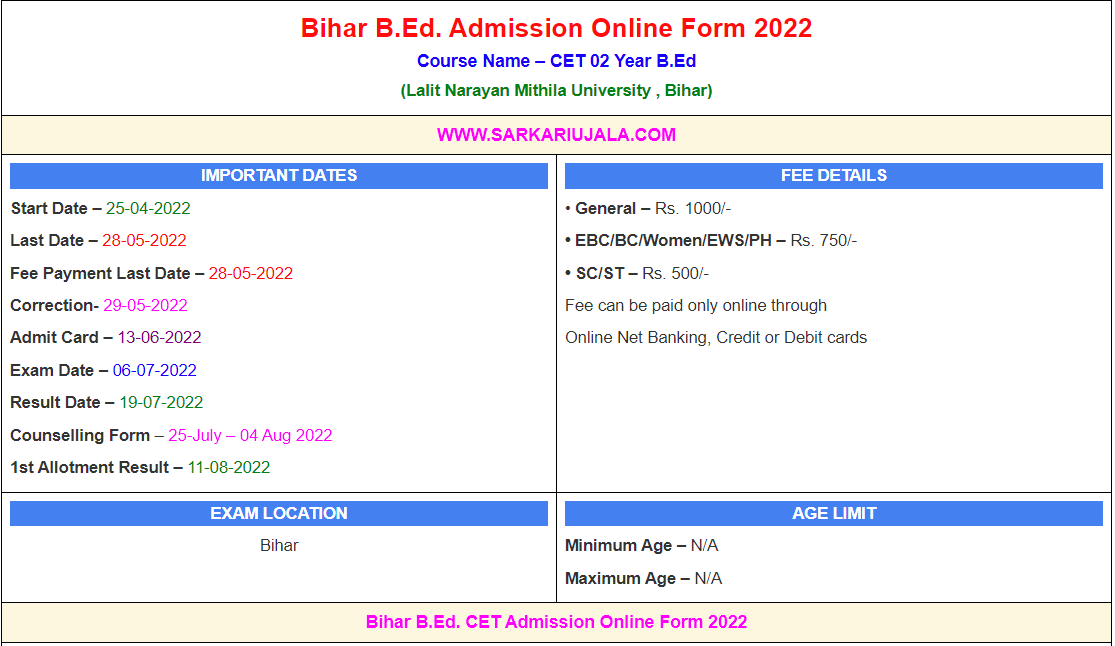 Details Of Recruitment Of Bihar B.Ed. CET Admission Online Form 2022