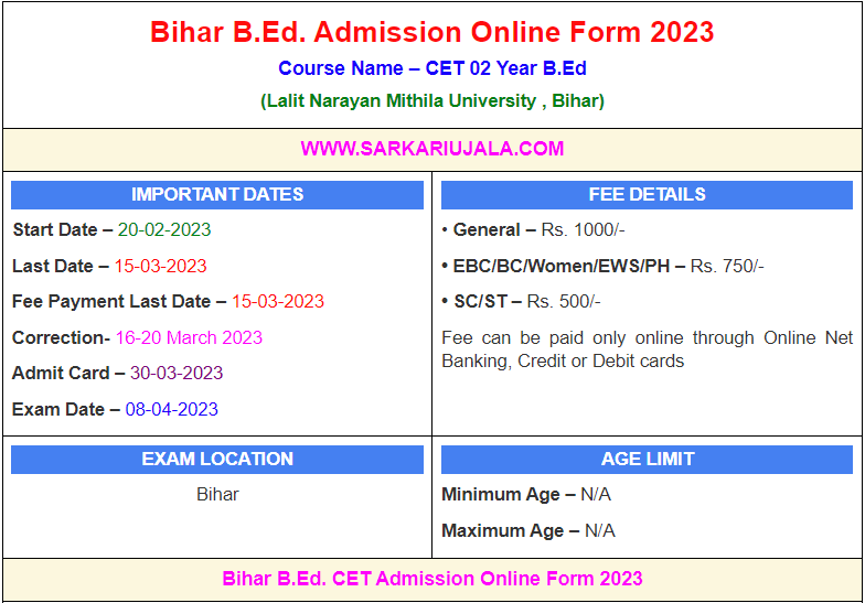 How to Apply Online Bihar B.Ed. CET Admission Online Form 2023Candidates can apply through link provided below or they can also apply through official site of the LNMU Lalit Narayan Mithila University , Bihar before 15/March/2023.