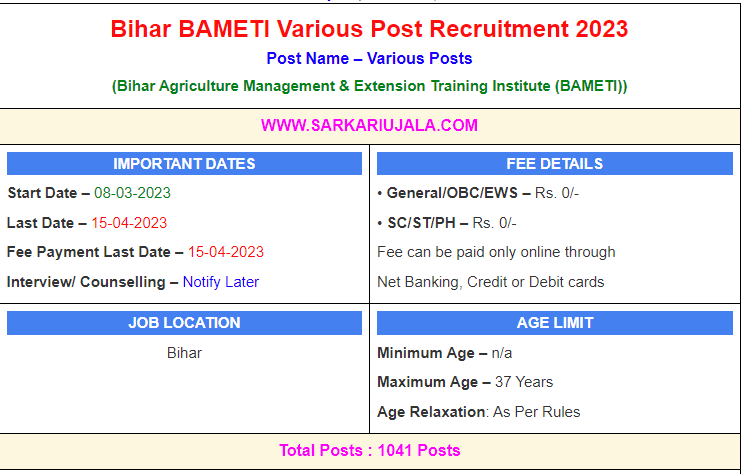 Bihar BAMETI Various Post Recruitment 2023Post Name – Various Posts(Bihar Agriculture Management & Extension Training Institute (BAMETI)) | |||||