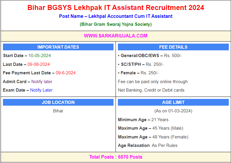 Post Description – BGSYS Bihar Gram Swaraj Yojna Society is inviting online applications for Lekhpal Accountant Cum IT Assistant for 6570 posts. Interested people meet all the eligibility criteria, apply online Details Of Recruitment Of Bihar BGSYS Lekhpak IT Assistant Online Form 2024Posts Name – Lekhpal Accountant Cum IT Number Of Posts – 6570 Posts Category Wise Posts – Male – 4270 Posts Female – 2300 Posts Pay Scale – As Per Rules Education Qualification – Bachelor Degree in Commerce B.Com OR Master Degree in Commerce M.Com OR CA Inter How to Apply Online Bihar BGSYS Lekhpak IT Assistant Online Form 2024 – Candidates can apply through link provided below or they can also apply through official site of the Bihar Gram Swaraj Yojna Society before 09/June/2024. Required Documents For Online Application – Educational Mark sheet And Certificates Aadhar Card / Pan Card Passport Size Photo Signature Selection Mode – Written Examination Merit List | |||||