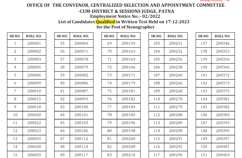 IMPORTANT DATESExam Date (Steno) – 17-12-2023 Admit Card – 10-12-2023 Result Date- 26-04-2024 Final Result Date (Court Reader )- 13-9-2024 | VACANCY DETAILSExam Name – Bihar District Court Group C Recruitment 2023 Total Vacancy- 7692 Posts Advt. No. – 02/2022 | ||||