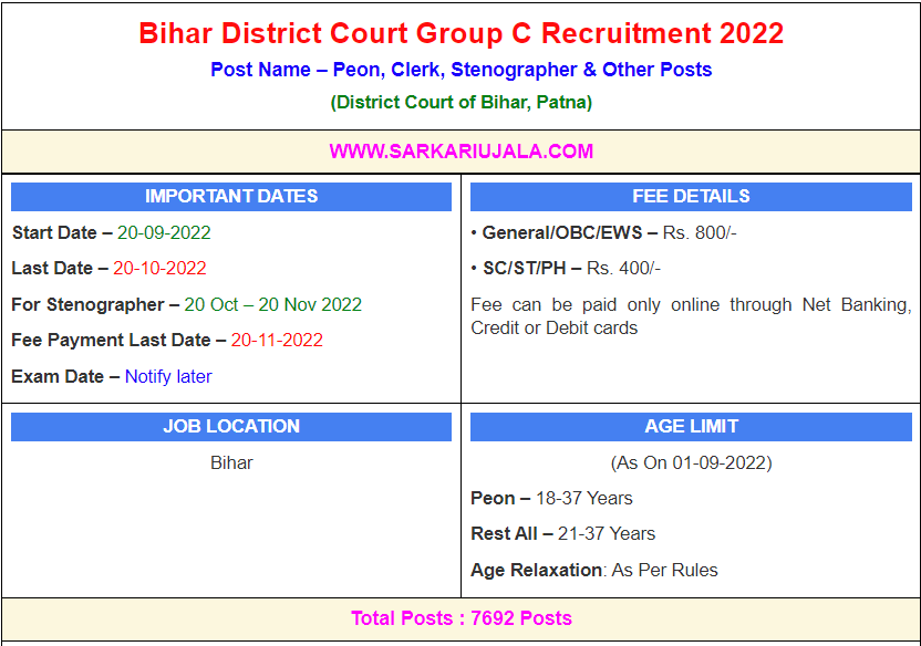 Post Description – District Court of Bihar, Patna is inviting online applications for Peon, Clerk, Stenographer & Other Posts for 7692 posts. Interested people meet all the eligibility criteria, apply online Details Of Recruitment Of Bihar District Court Group C Online Form 2022Posts Name – Peon, Clerk, Stenographer & Other Posts Number Of Posts – 7692 Posts Category Wise Posts – Clerk – 3325 Posts Stenographer – 1562 Posts Court Reader-cum-Deposition Writer – 1132 Posts Peon/Orderly – 1673 Posts Pay Scale – As Per Rules Education Qualification – Clerk – Bachelor Degree in Any Stream with Computer Knowledge. Stenographer – Bachelor Degree in Any Stream with Stenographer Certificate And Computer Proficiency. And English Shorthand 80 wpm and Hindi Short Hand 60 wpm . And Typing English : 80 wpm and Hindi 30 wpm . Court Reader-cum-Deposition Writer – Bachelor Degree in Any Stream with Certificate of English and Hindi Typing. Peon/Orderly – 10th Passed From Any Board How to Apply Online Bihar District Court Group C Online Form 2022 – Candidates can apply through link provided below or they can also apply through official site of the District Court of Bihar, Patna before 20/October/2022. Required Documents For Online Application – 10th / 12th Mark sheet And Certificates Aadhar Card / Pan Card Passport Size Photo Signature Selection Mode – Written Exam Skill Test Merit List