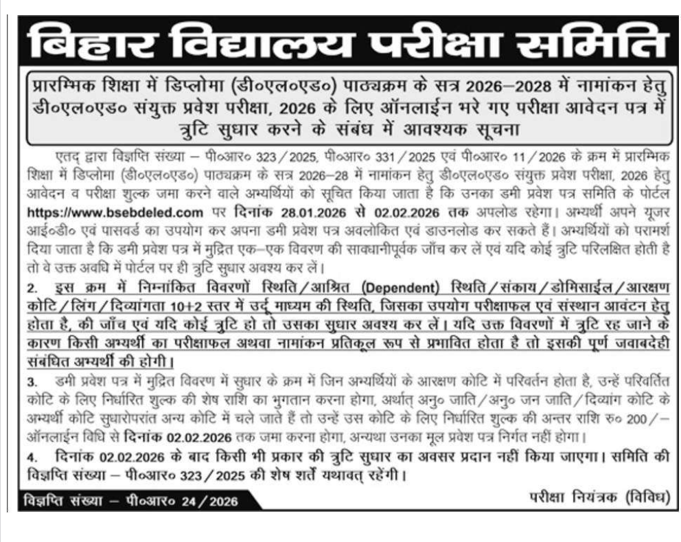 IMPORTANT DATESExam Date – 19 Jan – 18 Feb 2026 Dummy Admit Card – 28-01-2026 Admit Card – Notify Later Result Date –Notify Later | VACANCY DETAILSForm Name – Bihar D.El.Ed Admission Online Form 2026 | ||||