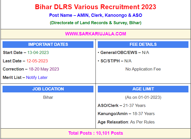 Bihar DLRS Various Recruitment 2023Post Name – AMIN, Clerk, Kanoongo & ASO(Directorate of Land Records & Survey, Bihar) | |||||