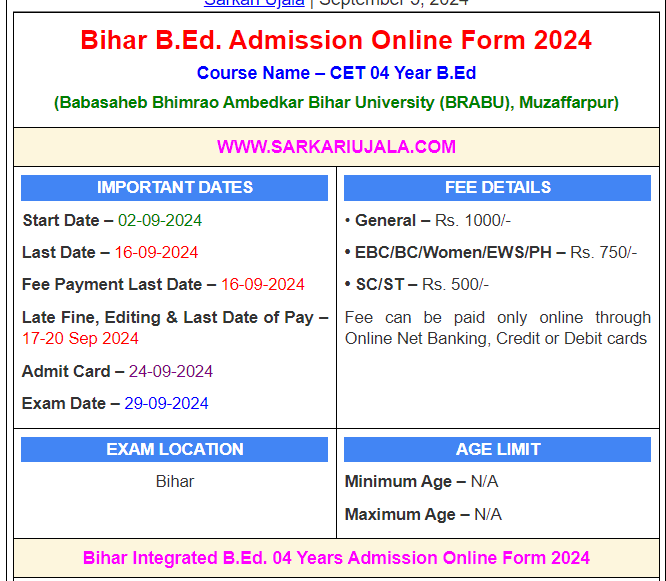 Post Description – BRBU Babasaheb Bhimrao Ambedkar Bihar University (BRABU), Muzaffarpur is inviting online applications for Bihar Integrated B.Ed. 04 Years Online Form 2024 . Interested people meet all the eligibility criteria, apply online Details Of Online Form Of Bihar Integrated B.Ed. 04 Years CET Entrance Exam 2024Education Qualification – 12th Passed With 50% marks (For reserved category it shall be 45% or its equivalent.) How to Apply Online Bihar Integrated B.Ed. 04 Years Online Form 2024 – Candidates can apply through link provided below or they can also apply through official site of the Babasaheb Bhimrao Ambedkar Bihar University (BRABU), Muzaffarpur before 16/September/2024. Required Documents For Online Application – Educational Mark sheet And Certificates Aadhar Card / Pan Card Passport Size Photo Signature Selection Mode – Written Exam Merit List