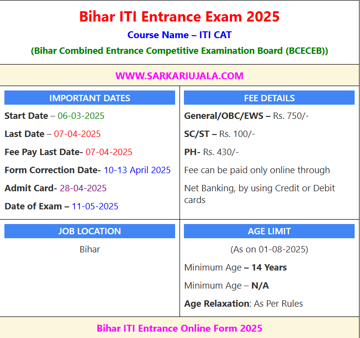 Bihar ITI Entrance Exam 2025Course Name – ITI CAT(Bihar Combined Entrance Competitive Examination Board (BCECEB)) | |||||