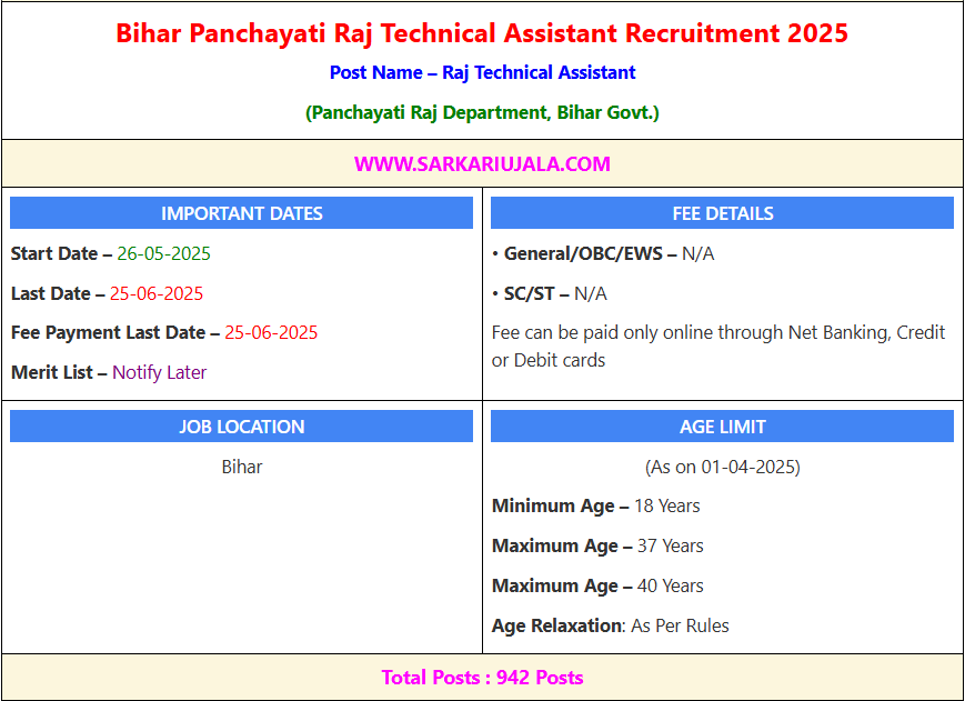 Bihar Panchayati Raj Technical Assistant Recruitment 2025Post Name – Raj Technical Assistant (Panchayati Raj Department, Bihar Govt.) | |||||