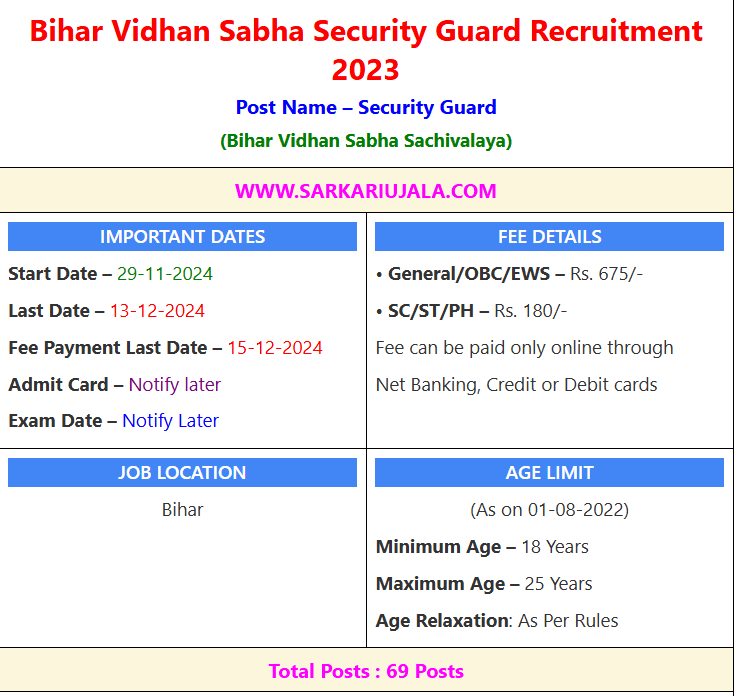 Bihar Vidhan Sabha Security Guard Recruitment 2023Post Name – Security Guard(Bihar Vidhan Sabha Sachivalaya) | |||||