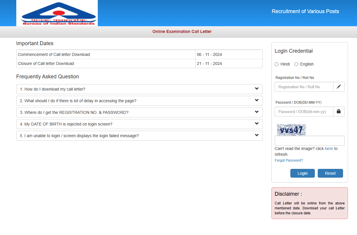 BIS Group Various Post Admit Card 2024Post Name – Various Posts (Bureau of Indian Standards) | |||||
