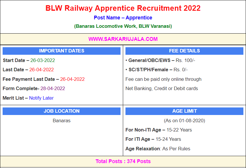 Post Description –BLW Banaras Locomotive Work, BLW Varanasi is inviting online applications for Apprentice for 374 posts. Interested people meet all the eligibility criteria, apply online Details Of Recruitment Of BLW Railway Apprentice Online Form 2022Posts Name – Apprentice Number Of Posts – 374 Posts Trade Wise Posts – For Non ITI Posts Fitter– 107 Posts Carpenter – 03 Posts Painter – 07 Posts Machinist – 67 Posts Welder (G & E) – 45 Posts Electrician – 71 Posts For ITI Posts Fitter– 30 Posts Machinist – 15 Posts Welder (G & E) – 11 Posts Electrician – 18 Posts Pay Scale – As Per Rules Education Qualification – ITI Posts- 10th Passed With 50% Marks With ITI In Related Trade Non ITI Posts- 10th Passed With 50% Marks How to Apply Online BLW Railway Apprentice Online Form 2022 – Candidates can apply through link provided below or they can also apply through official site of the Banaras Locomotive Work, BLW Varanasi before 26/April/2022. Required Documents For Online Application – 10th / ITI Mark sheet And Certificates Aadhar Card / Pan Card Passport Size Photo Signature Selection Mode – Final Merit List