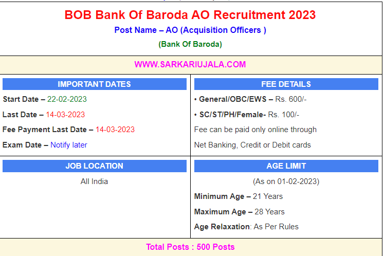 Post Description – BOB Bank Of Baroda is inviting online applications for AO Acquisition Officers for 500 posts. Interested people meet all the eligibility criteria, apply online Details Of Recruitment Of BOB Bank Of Baroda AO Online Form 2023Posts Name – Acquisition Officers Number Of Posts – 500 Posts Category Wise Posts – General – 203 Posts OBC – 135 Posts SC – 75 Posts ST – 37 Posts EWS – 50 Posts Pay Scale – Metro cities: Rs. 5 Lakhs p.a. & Non Metro cities: Rs. 4 lakhs p.a. Education Qualification – Graduation Degree in any discipline from a University recognized with 1 Year Experience. How to Apply Online BOB Bank Of Baroda AO Online Form 2023 – Candidates can apply through link provided below or they can also apply through official site of the BOB Bank Of Baroda before 14/March/2023. Required Documents For Online Application – Educational Mark sheet And Certificates Aadhar Card / Pan Card Passport Size Photo Signature Selection Mode – Online Exam Interview Merit List