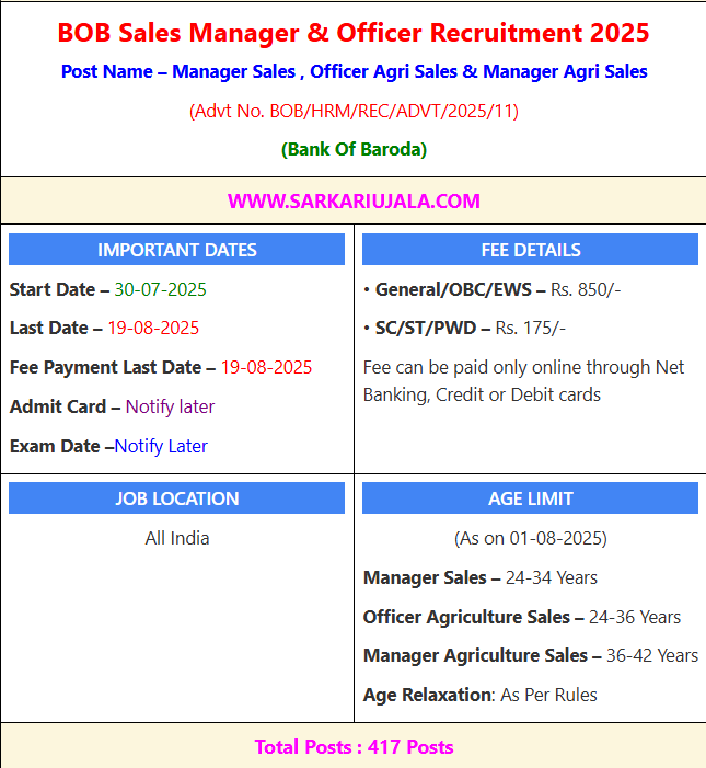 Post Description – BOB Bank Of Baroda Is Inviting Online Application Form For 417 Posts For Manager Sales , Officer Agri Sales & Manager Agri Sales Posts . Eligible Candidates Can Apply Online Form Using Official Website. Details Of Recruitment Of BOB Sales Manager & Officer Online Form 2025 Posts Name – Manager Sales , Officer Agri Sales & Manager Agri Sales Number Of Posts – 417 Posts Categories Wise Posts : Manager Sales – 227 Posts Agriculture Marketing Officer – 142 Posts Agriculture Marketing Manager – 48 Posts Pay Scale – As Per Rules Education Qualification – Manager Sales – Graduation in any discipline Agriculture Marketing Officer/ Agriculture Marketing Manager – 4-year Degree (graduation) in Agriculture / Horticulture / Animal Husbandry / Veterinary Science / Dairy Science / Fishery Science / Pisciculture / Agri. Marketing & Cooperation / Cooperation & Banking / Agro-Forestry / Forestry/ Agricultural Biotechnology / B.Tech Biotechnology / Food Science / Agriculture Business Management / Food Technology / Dairy Technology /Agricultural Engineering/ Sericulture / Fisheries Engineering How to Apply Online BOB Sales Manager & Officer Online Form 2025 – Candidates can apply through link provided below or they can also apply through official site of the Bank Of Baroda Bank before 26/August/2025. Required Documents For Online Application – Educational Mark sheet And Certificates Aadhar Card / Pan Card Passport Size Photo Signature Selection Mode – Online Exam Final Merit List | |||||