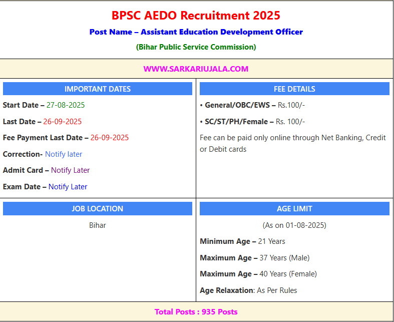 Post Description – BPSC Bihar Public Service Commission is inviting online applications for AEDO for 935 posts. Interested people meet all the eligibility criteria, apply online Details Of Recruitment Of BPSC AEDO Online Form 2025Posts Name – Assistant Education Development Officer Number Of Posts – 935 Posts Category Wise Posts – General – 374 Posts OBC – 112 Posts EBC – 168 Posts BC Female– 28 Posts SC – 150 Posts ST – 10 Posts EWS – 93 Posts Pay Scale – As Per Rules Education Qualification – Bachelor Degree in Any Stream From A Recognized University in India How to Apply Online BPSC AEDO Online Form 2025 – Candidates can apply through link provided below or they can also apply through official site of the Bihar Public Service Commission before 26/September/2025. Required Documents For Online Application – Educational Mark sheet And Certificates Aadhar Card / Pan Card Passport Size Photo Signature Selection Mode – Written Exam Document Verification Final Merit List