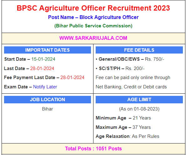 Post Description – BPSC Bihar Public Service Commission is inviting online applications for Block Agriculture Officer for 1051 posts. Interested people meet all the eligibility criteria, apply online Details Of Recruitment Of BPSC Bihar Block Agriculture Officer Online Form 2024Posts Name –Block Agriculture Officer Number Of Posts – 1051 Posts Category Wise Posts – Block Agriculture Officer – 155 Posts Sub-Divisional Agriculture Officer/Deputy Project Director (Aatma)/Assistant Director (Crops) – 19 Posts Assistant Director (Agriculture Engg.) – 11 Posts Assistant Director (Plant Protection) – 866 Posts Pay Scale – As Per Rules. Education Qualification – Block Agriculture Officer – Bachelor’s degree in Agricultural Science (B.Sc. Agriculture) from a recognized university/institute. Sub-Divisional Agriculture Officer/Deputy Project Director (Aatma)/Assistant Director (Crops) – Bachelor Degree in Agriculture Science (B.Sc. Ag.) from any recognized Agriculture University. Assistant Director (Agriculture Engg.) – Bachelor’s degree in Agricultural Engineering from a recognized Agricultural University. Assistant Director (Plant Protection) – Bachelor’s degree in Elective Plant Protection from a recognized Agricultural University. How to Apply Online BPSC Agriculture Officer Online Form 2024 – Candidates can apply through link provided below or they can also apply through official site of the Bihar Public Service Commission before 28/January/2024. Required Documents For Online Application – Educational Mark sheet And Certificates Aadhar Card / Pan Card Passport Size Photo Signature Selection Mode – Written Exam Interview Merit List