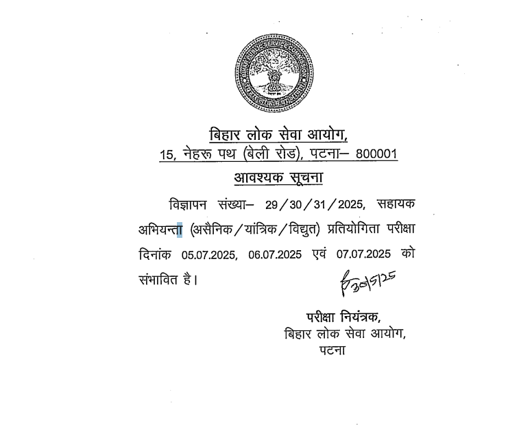 IMPORTANT DATESExam Date – 05-07 July 2025 Admit Card – Notify Later Result Date- Notify Later | COURSE DETAILSExam Name – BPSC Engineering Service Recruitment, 2025 Total Posts – 1024 Posts Advt. No – 29-31/2025 | ||||