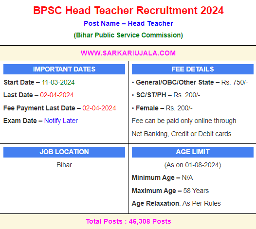 Post Description – BPSC Bihar Public Service Commission is inviting online applications for Head Teacher for 46,308 posts. Interested people meet all the eligibility criteria, apply online Details Of Recruitment Of BPSC Head Teacher Online Form 2024Posts Name – Head Teacher Number Of Posts – 46, 308 Posts Category Wise Posts – Head Teacher (Education Department ) – 40247 Posts General – 10081 Posts EBC – 10056 Posts BC – 7245 Posts SC – 8041 Posts ST – 806 Posts EWS – 4018 Posts Head Teacher (SC & ST Welfare Dept) – 6061 Posts General – 1340 Posts EBC – 1595 Posts BC – 1139 Posts SC – 1283 Posts ST – 128 Posts EWS – 576 Posts Pay Scale – Rs. 35,000/ – Per Month Education Qualification – Head Teacher (25/2024) – Government Primary School Teacher with 8 Year Experience. Head Teacher (26/2024) – Domicile in Bihar State Master Degree with Minimum 50% Marks. And B.Ed / B.A.Ed / B.Sc Ed Exam Passed. And Teacher Eligibility Test TET Passed For More Experience Details : Read the Official Notification. How to Apply Online BPSC Head Teacher Online Form 2024 – Candidates can apply through link provided below or they can also apply through official site of the Bihar Public Service Commission before 02/April/2024. Required Documents For Online Application – Educational Mark sheet And Certificates Aadhar Card / Pan Card Passport Size Photo Signature Selection Mode – Written Exam Merit List