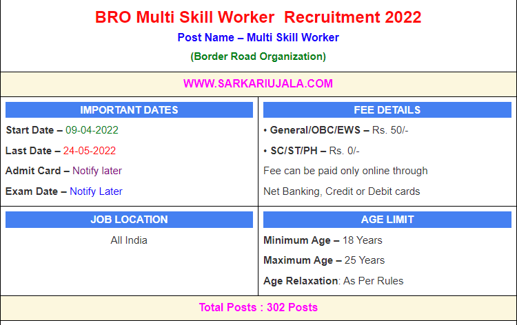 Post Description –BRO Border Road Organization is inviting Offline applications for Multi Skill Worker for 302 posts. Interested people meet all the eligibility criteria, apply online Details Of Recruitment Of BRO Multi Skill Worker Offline Form 2022Posts Name – Multi Skill Worker Number Of Posts – 302 Posts Category Wise Posts – Multi Skilled Worker (Mason) – 147 Posts Multi Skilled Worker (Nursing Assistant) – 155 Posts Pay Scale – As Per Rules Education Qualification – Multi Skilled Worker (Mason)- 10th & ITI/Certificate in Mason. Multi Skilled Worker (Nursing Assistant)- 12th With Biology & Nursing Certificate/ANM/ Pharmacy. How to Apply Online BRO Multi Skill Worker Offline Form 2022 – Candidates can apply through Offline provided below Address of the Border Road Organization before 24/May/2022. Send Application Form To – “Commandant GREF Centre, Dighi camp, Pune- 411015” Format For Envelope- APPLICATION FOR THE POST OF ____________ Category UR/SC/ST/OBC/EWSs/ESM/CPL, WEIGHTAGE PERCENTAGE IN ESSENTIAL QUALIFICATION ________________________ on the top of the envelope . Required Documents For Online Application – Educational Mark sheet And Certificates Aadhar Card / Pan Card Passport Size Photo Signature Selection Mode – Written Examination PET/PST Medical Test Final Merit List